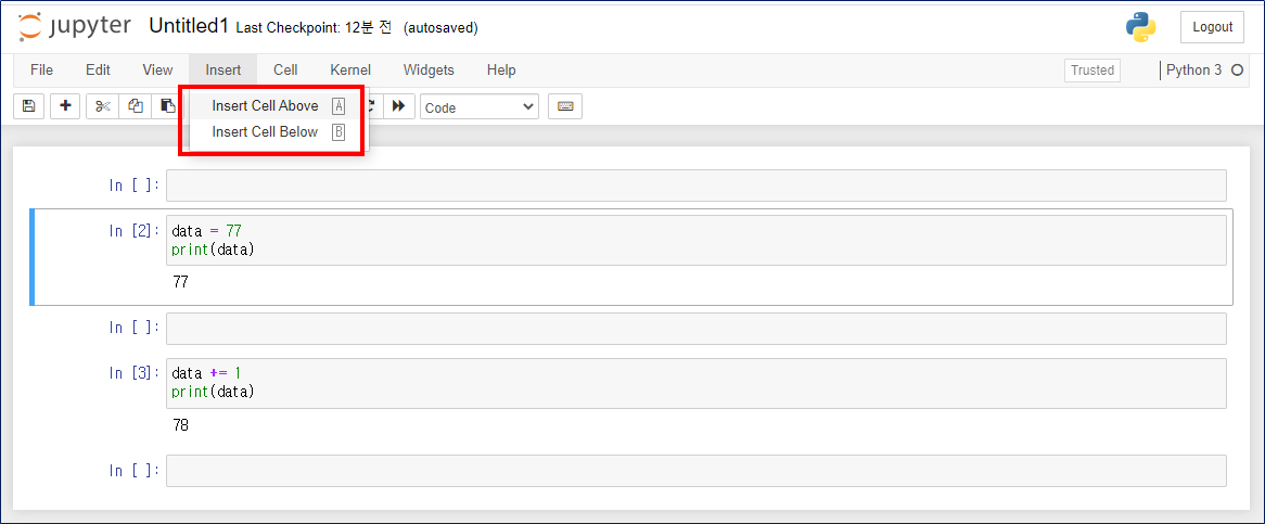 - Insert Cell Above : 선택된 셀 위쪽에 셀을 추가한다. (Above)