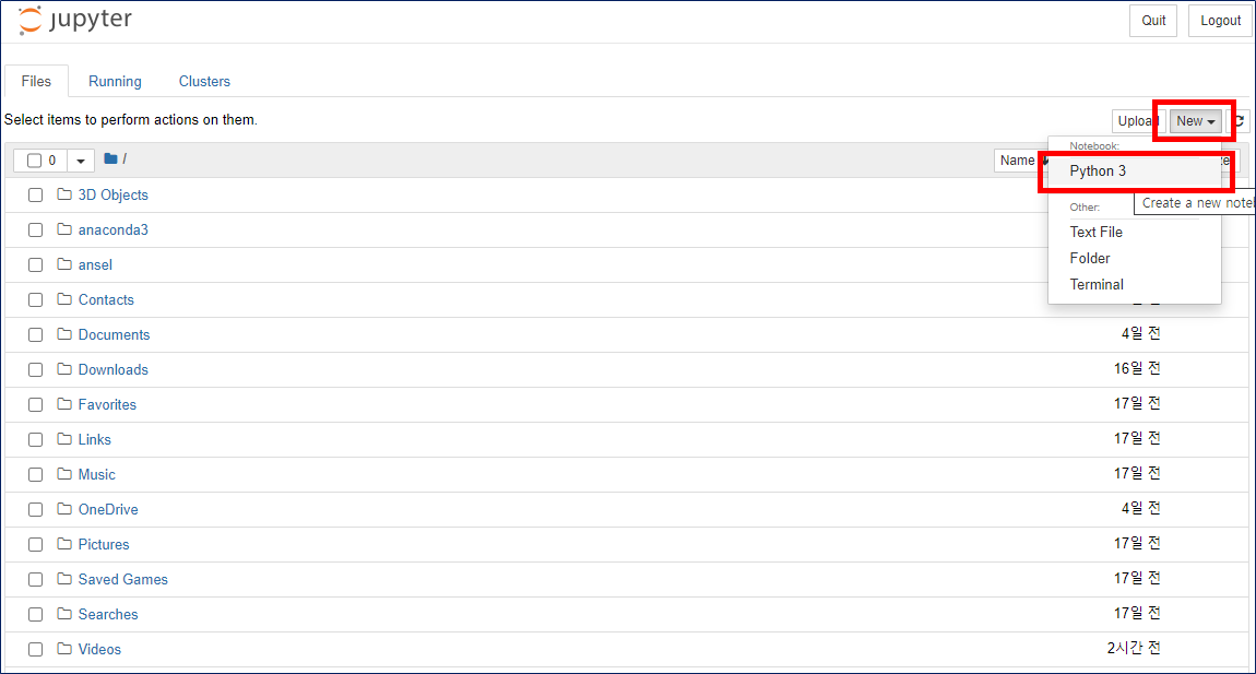 메인화면에서 New 버튼을 클릭 -> Python 3 클릭