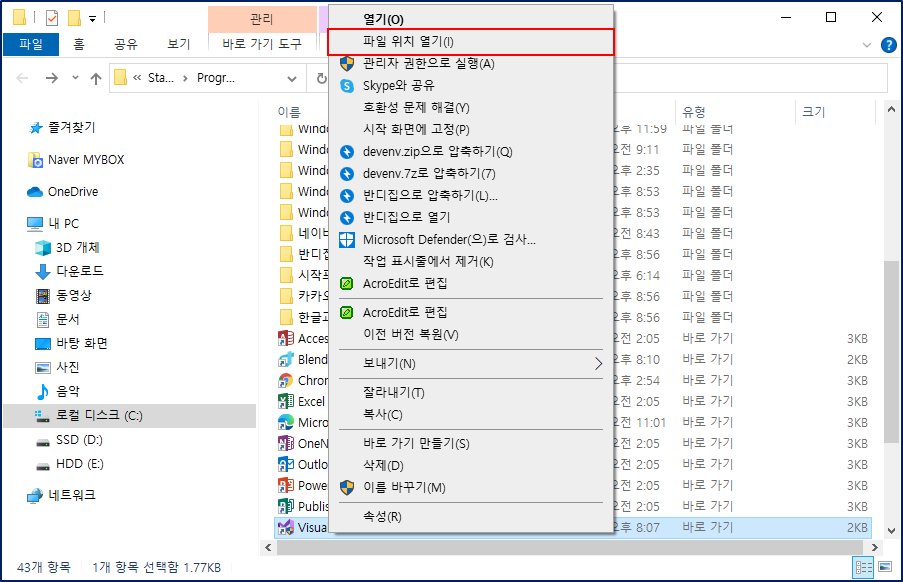 1. 'Visual Studio 2019' 바로가기 폴더에서 우클릭 - 속성 - 파일 위치 열기 클릭