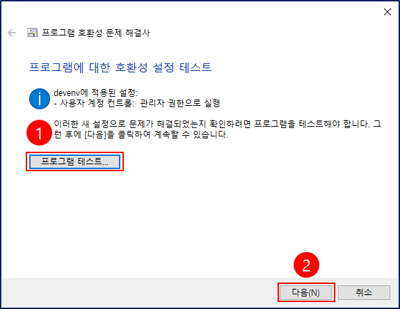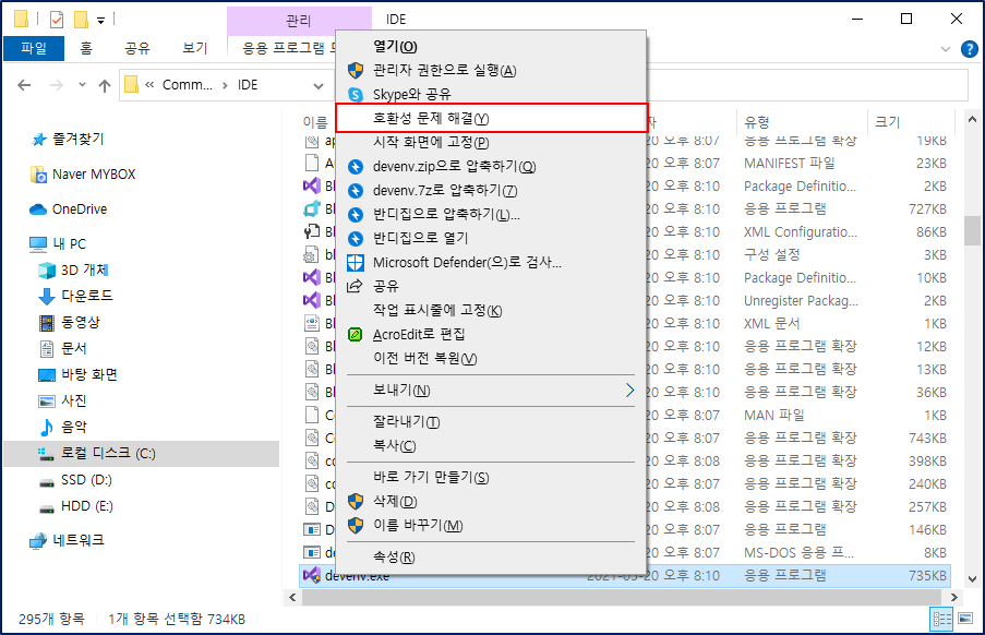 2. 새로 열리는 폴더에서 'devenv.exe' 파일을 우클릭 - 호환성 문제 해결 클릭