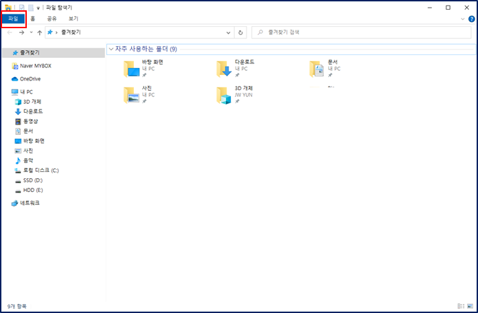 우선 Windows 10 디폴트 값으로 파일 탐색기를 실행하면 자주 사용하는 폴더가 나오는데