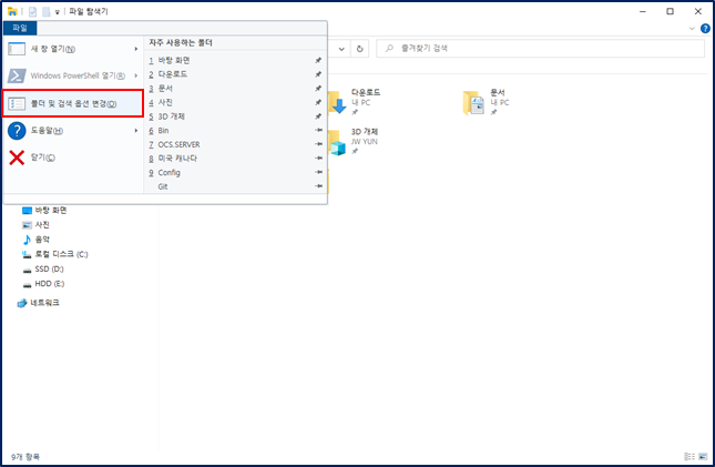 2. [ 파일 ] - [ 폴더 및 검색 옵션 변경] 클릭