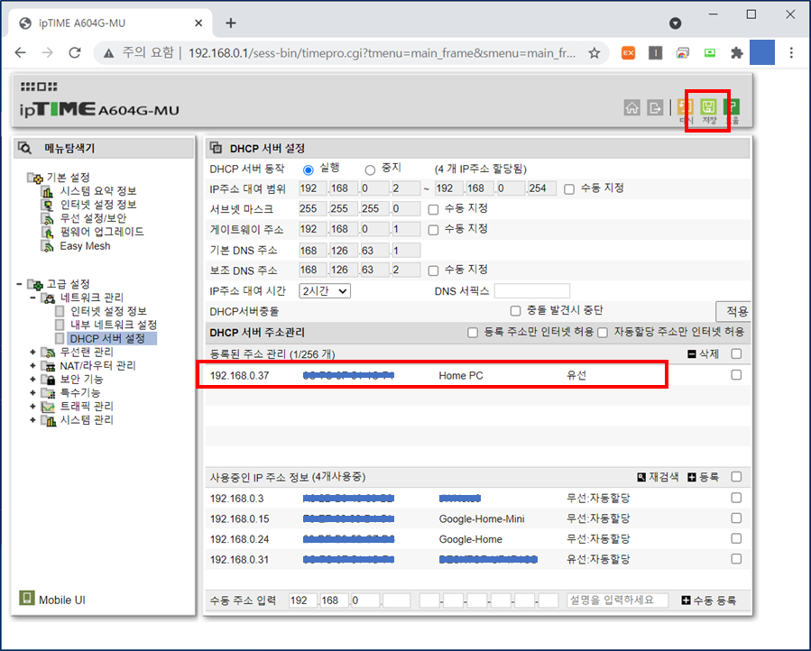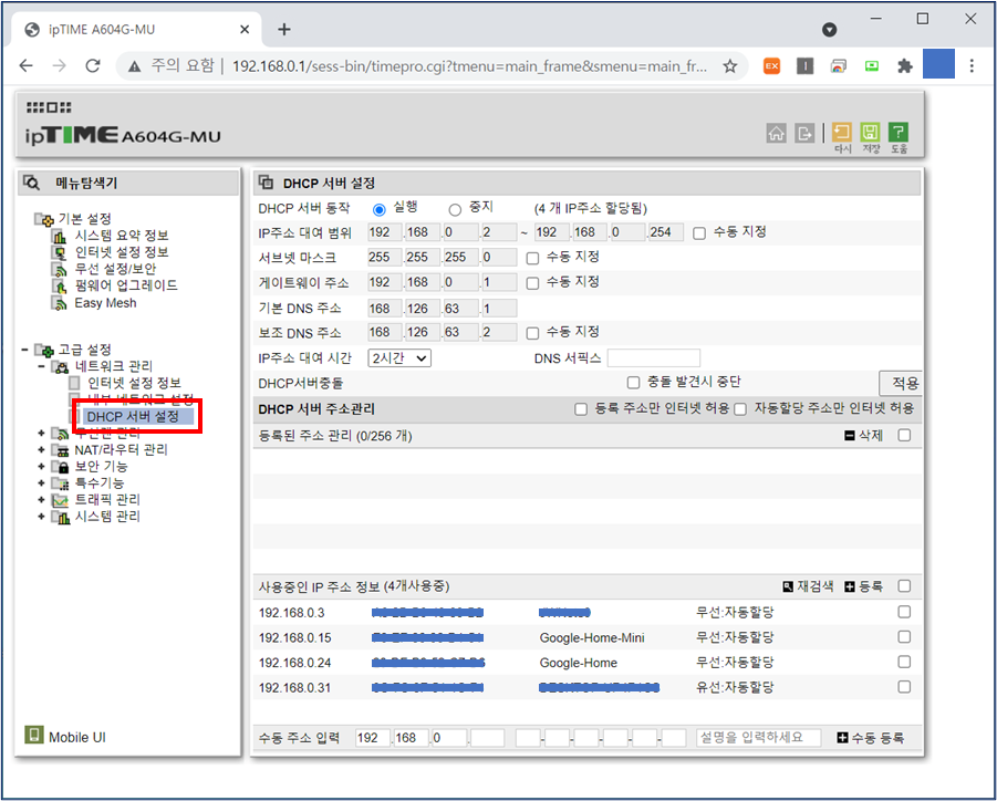 - 사용중인 IP 주소 정보 : 현재 공유기에 연결된 IP정보를 보여준다. (자동할당인지 고정인지 확인가능)