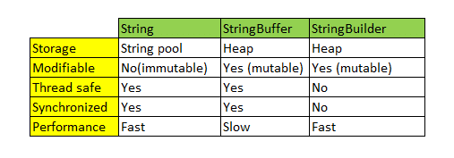 - 앞서 서술한것과 같이 String은 불변속성을 가지고 있고 StringBuilder와 StringBuffer는 가변속성을 가지고 있다. 이는 String 클래스와는 다르게 문자열의 연산이 발생할 때, 매번 새로운 메모리 영역을 할당하는게 아니라 기존의 메모리 버퍼 크기를 늘리며 유연하게 동작한다. 따라서 문자열 연산에 있어서는 String 클래스 보다 빠르다. (StringBuilder와 StringBuffer 클래스가 제공하는 메서드는 동일하다.)