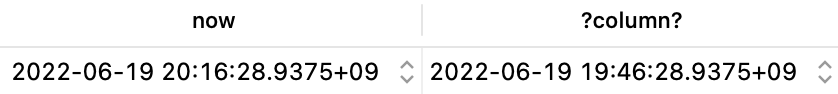 SELECT NOW(), NOW() - INTERVAL'30 MINUTE';
