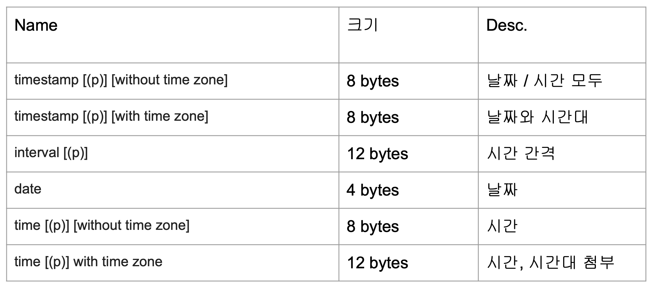 시간 타입 postgresql의 시간 관리용 타입으로는 timestamp, date, time 등이 있다. timestamp는 날짜와 시...