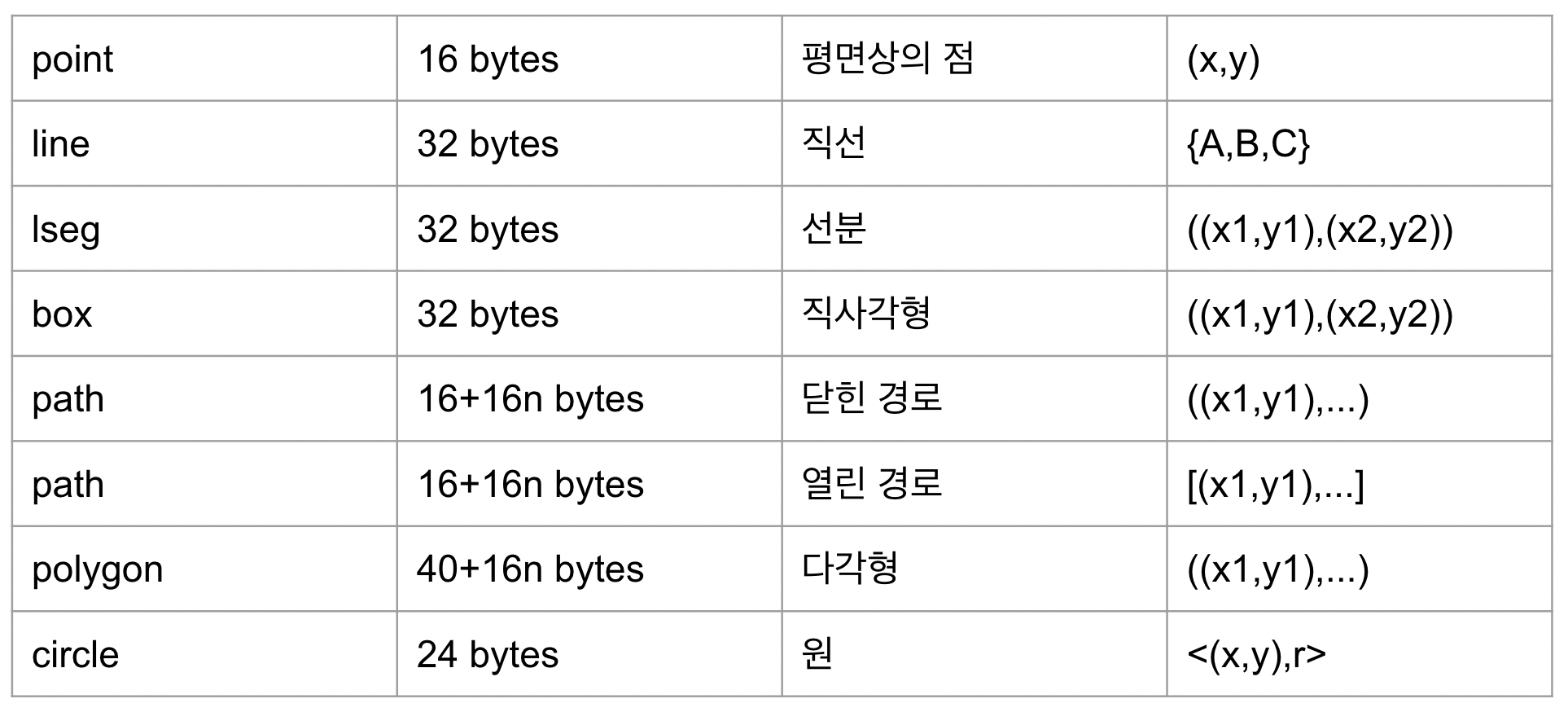 PSQL에서는 기존의 다른 RDBMS와는 다르게 2차원 공간의 객체를 나타내는 타입을 가지고 있다.