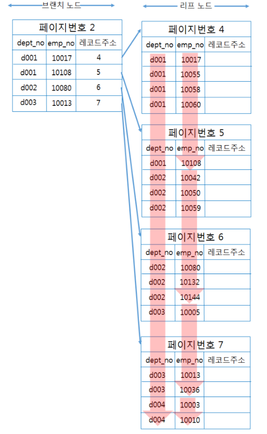 우선 dept_no으로 한 번 거르고 그 다음 emp_no를 탐색한다.