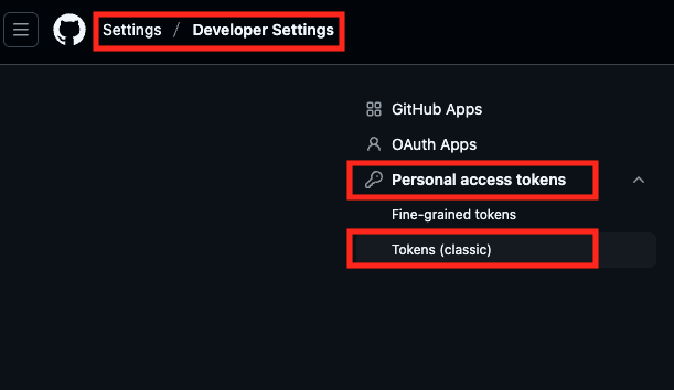 GitHub > Settings > Developer Settings > Personal Access Token 생성