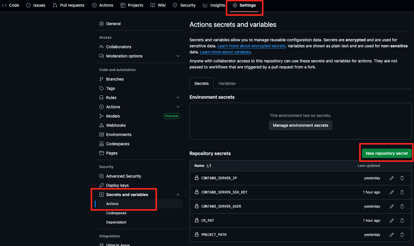 GitHub 리포지토리 페이지에서 Settings > Secrets and variables > Actions로 이동한 후 위의 정보를 New repository secret으로 추가합니다.