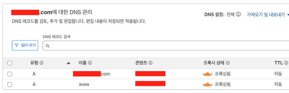 Cloudflare의 DNS 탭에서 아래처럼 A 레코드를 추가한다.